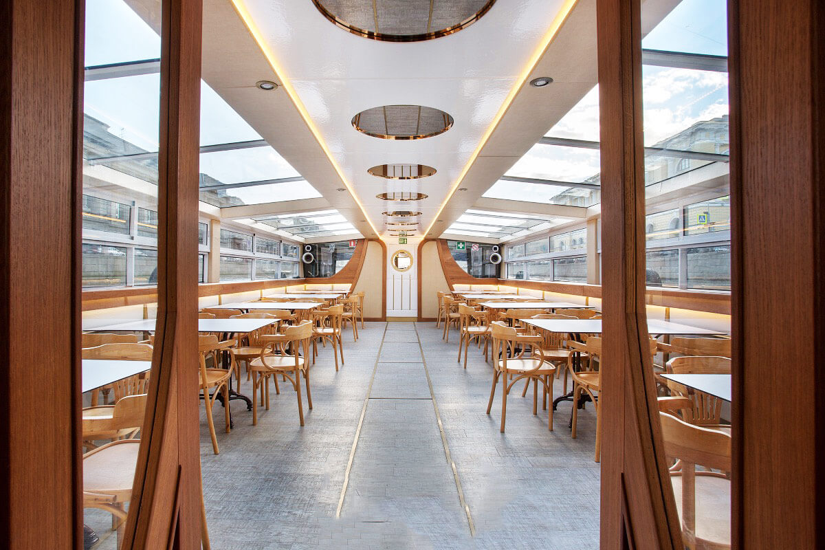 Новый теплоход 2016 года со светлым и изящным интерьером не нуждается в дополнительном оформлении или украшении. Панорамный салон, приятная гамма интерьера, открытая палуба, свежий ремонт выделяют этот теплоход среди аналогов на рынке.