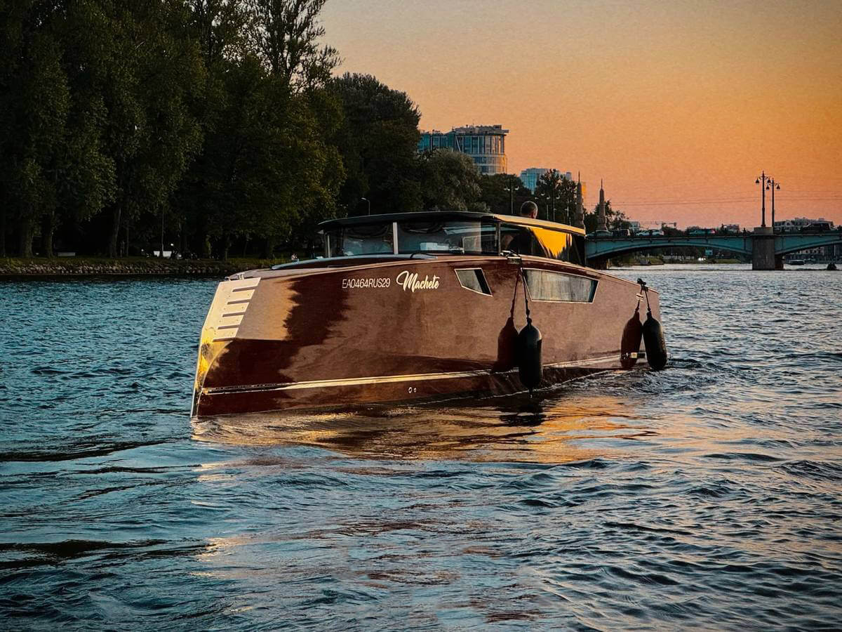 Катер «Machete» — абсолютно новое эксклюзивное судно, которое было произведено по индивидуальному заказу в 2024 году, способное вместить до 8 человек. Он оснащен всем необходимым для комфортного отдыха на воде: полноценным крытым теплым салоном, мягкой зоной на носу, а также вместительной открытой зоной со столом. На борту имеется кофемашина, что может быть лучше, чем наслаждаясь ароматом прекрасного кофе, сидя за столиком со своими близкими или друзьями, при этом плывя по водным просторам Северной столицы.
