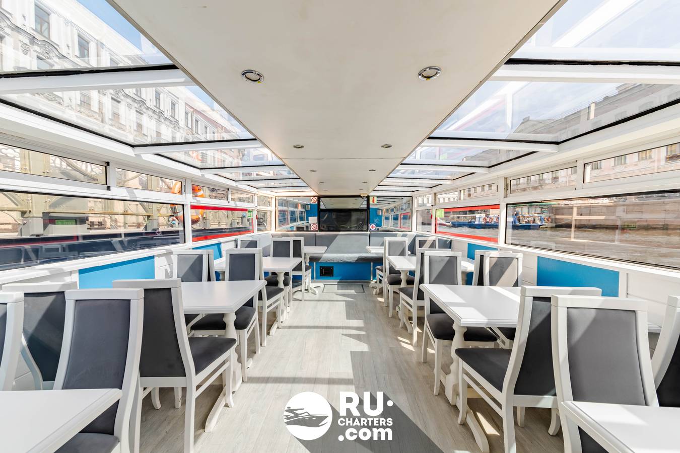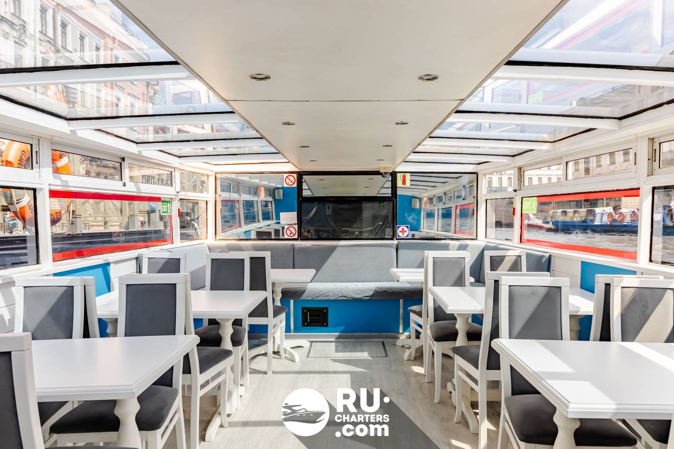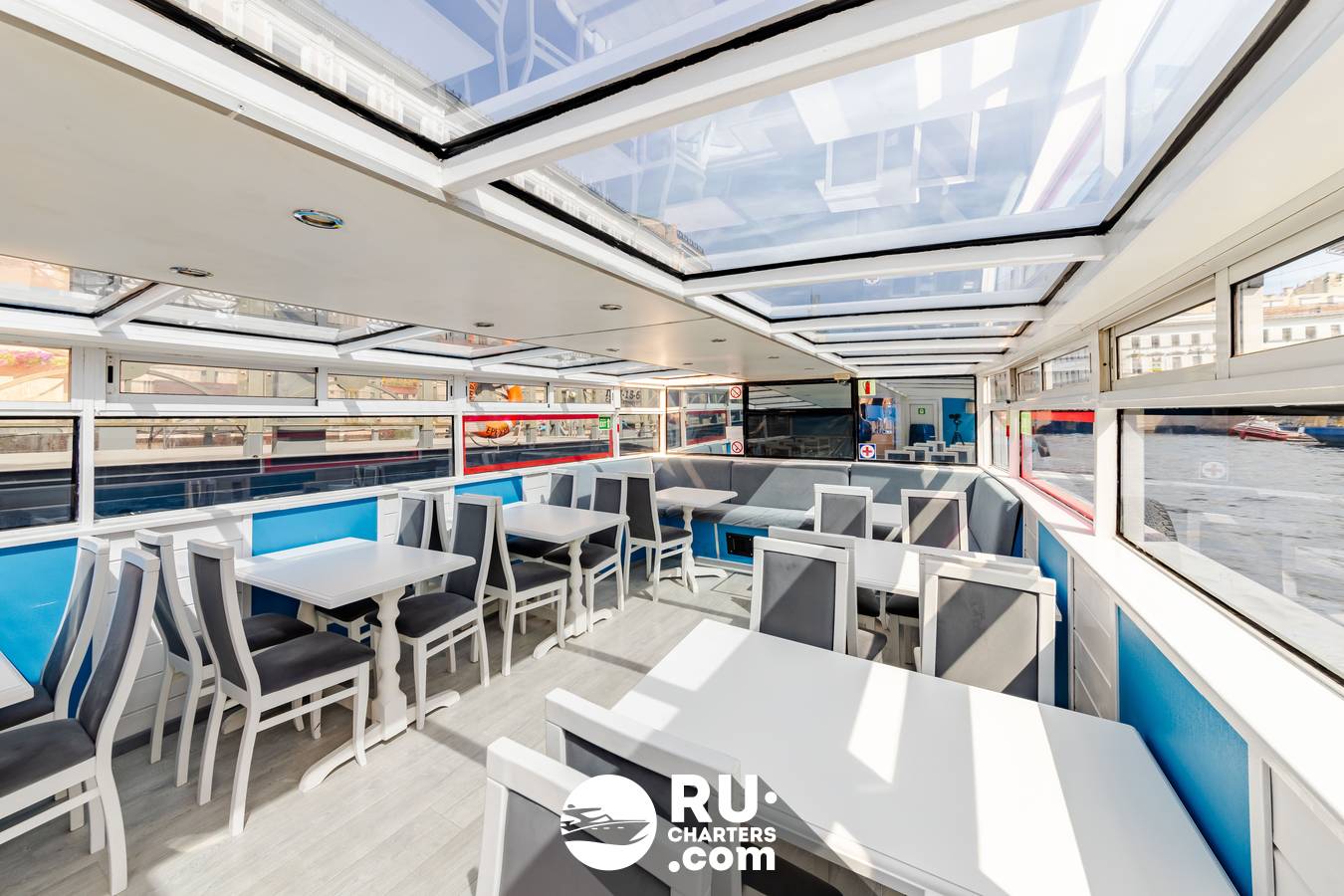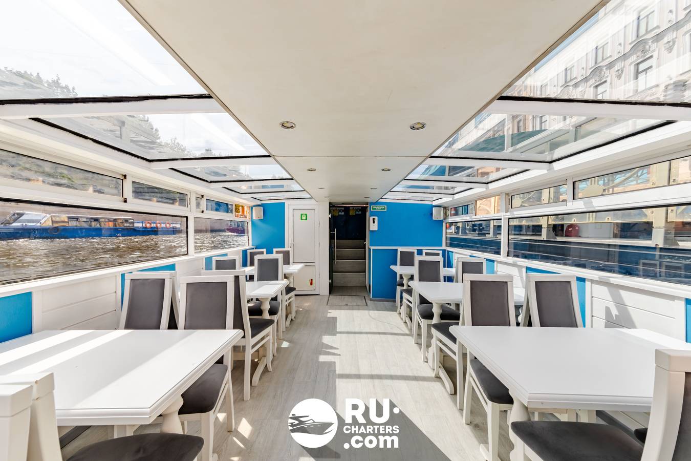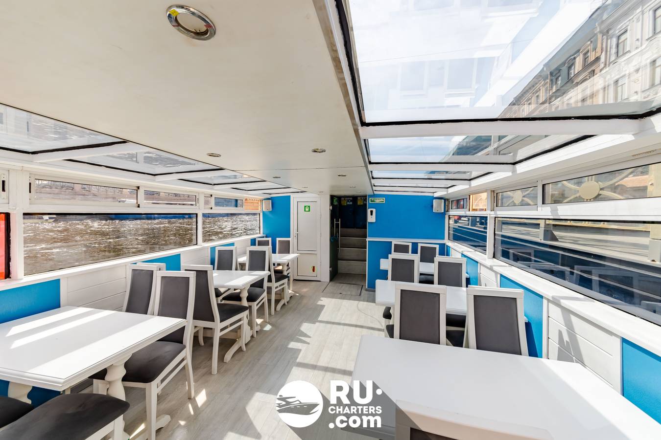 Теплоход «Русалочка» сочетает продуманный дизайн, современное оборудование и комфортное пространство на борту, что позволяет реализовать любой сценарий — от интерактивной программы до спокойной прогулки с напитками и музыкой. Стеклянная крыша и панорамные окна, делают салон светлым и уютным не зависимо от погодных условий, а акустическая система даёт возможность трансляции, как в салоне, так и на открытой палубе.