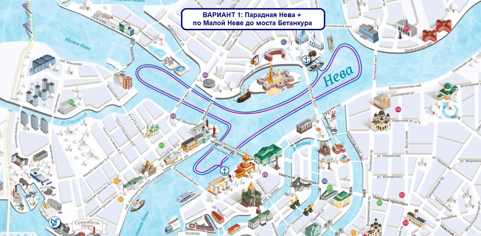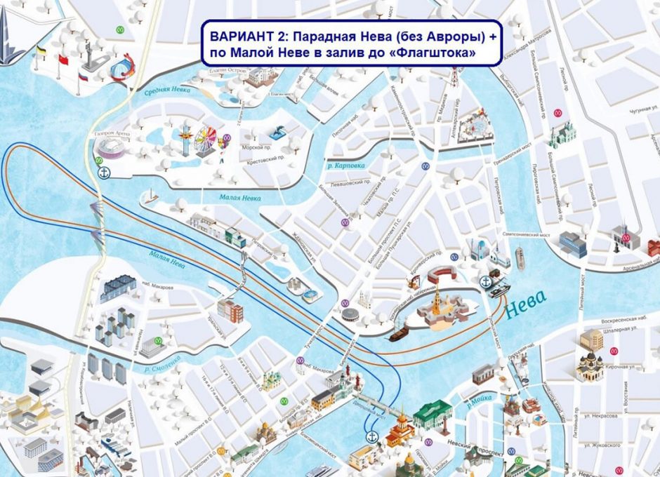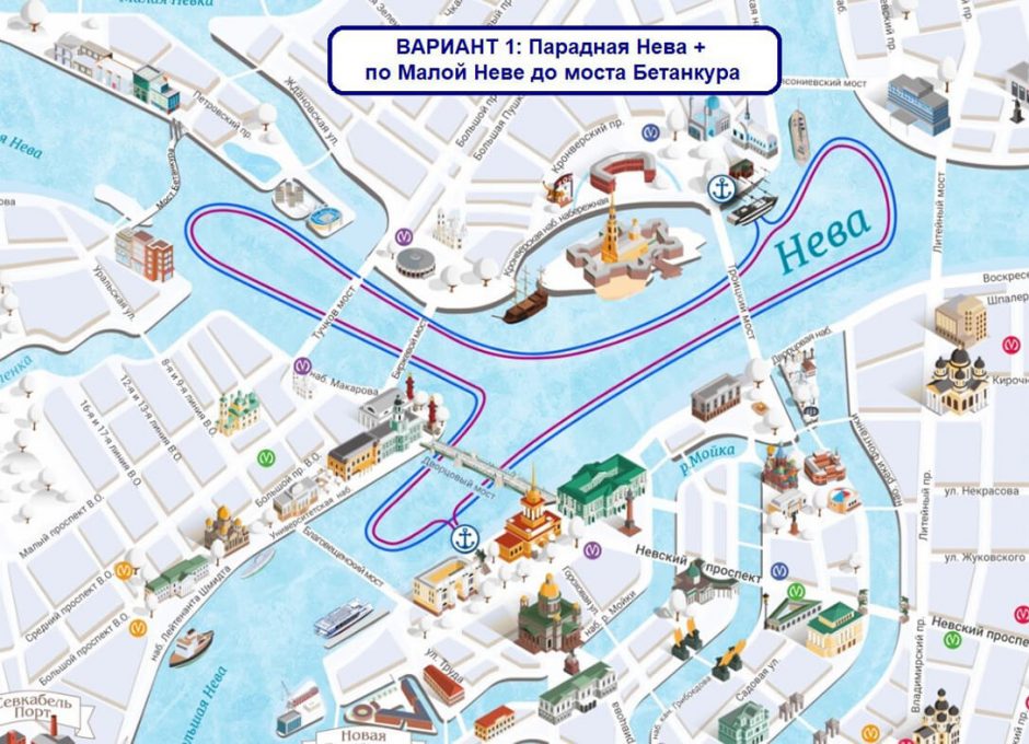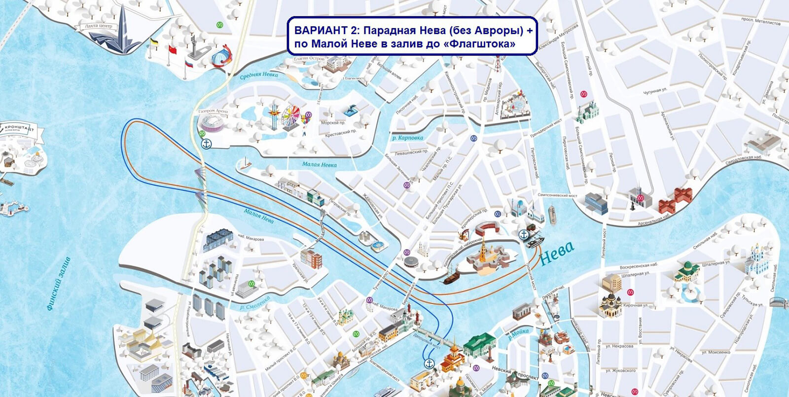 Если есть нарушения в ледовом покрытии, то по Малой Неве до моста Бетанкура + Парадная часть города (фотоостановка в центре).